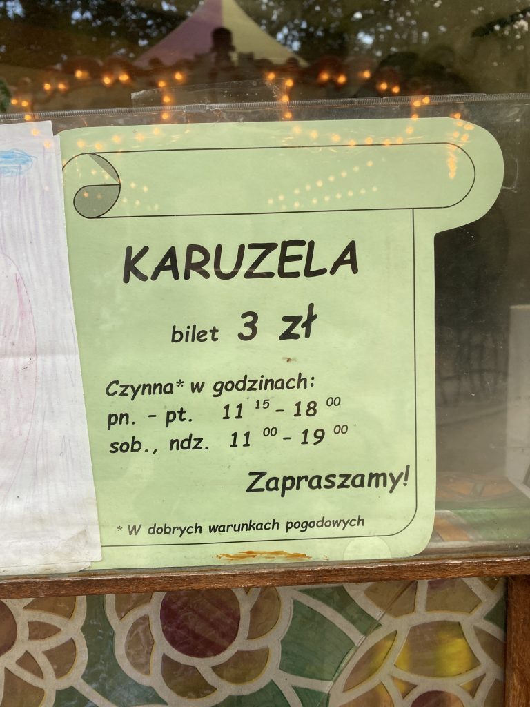 Godziny są poglądowe. Przy dobrej pogodzie karuzela jest czynna dłużej, natomiast przy złej – odwrotnie.