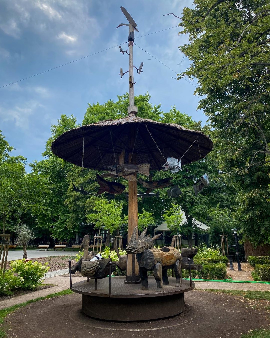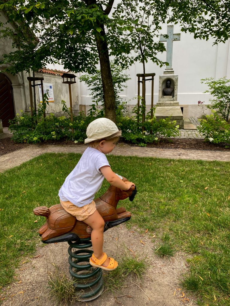 Drewniana karuzela autorstwa Józefa Wilkonia, napędzana mięśniami rodzicow, cioć i dziadków😜 miniplac zabaw, hotel dla owadów, bujaki dla dzieci i grób Staszica. Są też dwa osły, ale nic więcej o nich nie wiem. Do „atrakcji” zwierzęcych podchodzę z dużym dystansem – generalnie jestem przeciwna trzymaniu zwierząt w otoczeniu nieadekwatnym do ich potrzeb. Na szczęście od dwóch sezonów wisi tam tablica o zakazie dokarmiania, mam nadzieję, że respektowana.