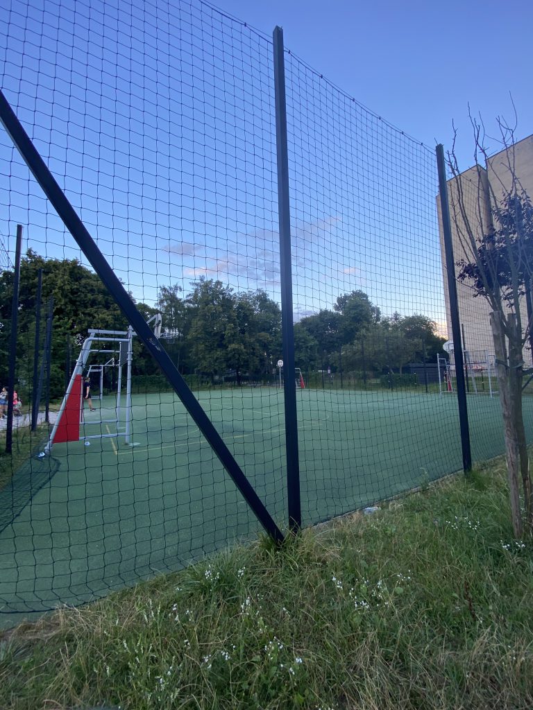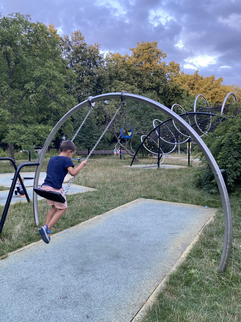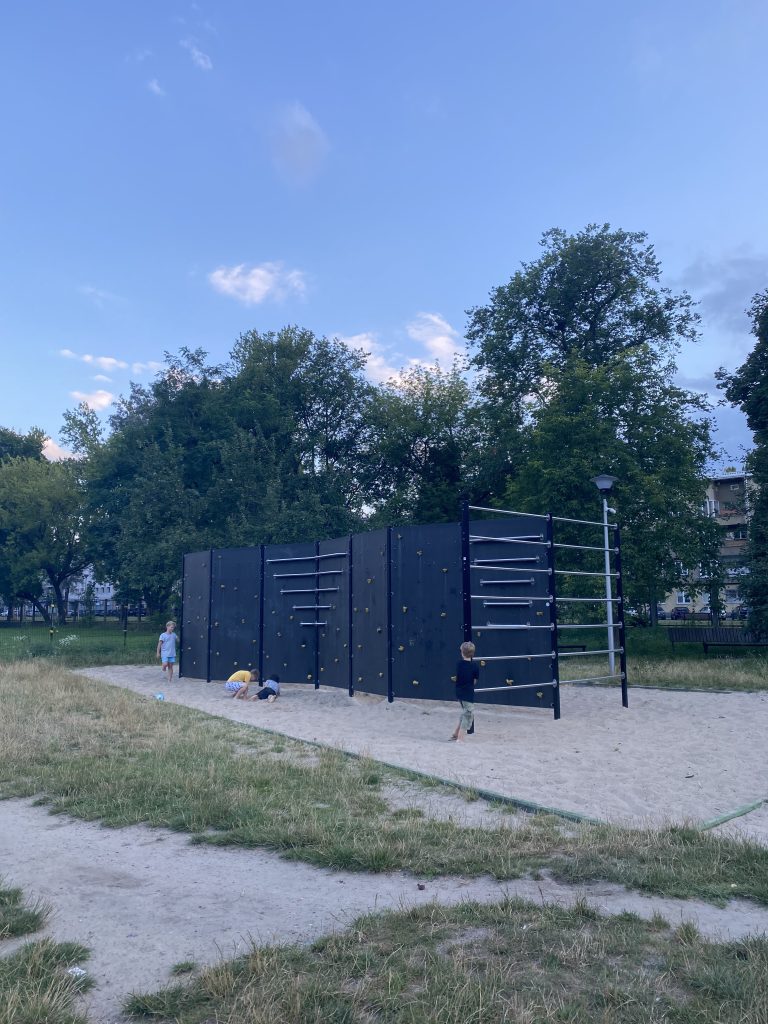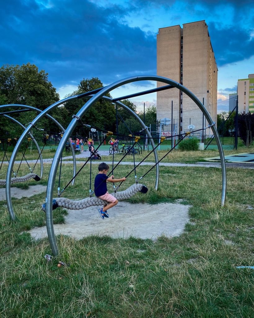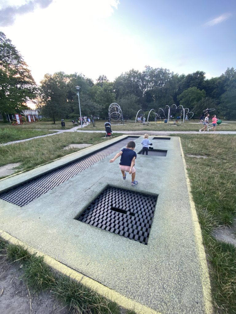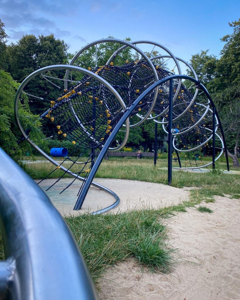 Znajdziecie tu mosty linowe dla dzieci, różne huśtawki, ciekawą karuzelę, piaskownicę, boisko, ściankę wspinaczkową oraz siłownię na świeżym powietrzu. Jest dosyć dużo zieleni i drzew, a więc i szansa na cień w upalne letnie dni.