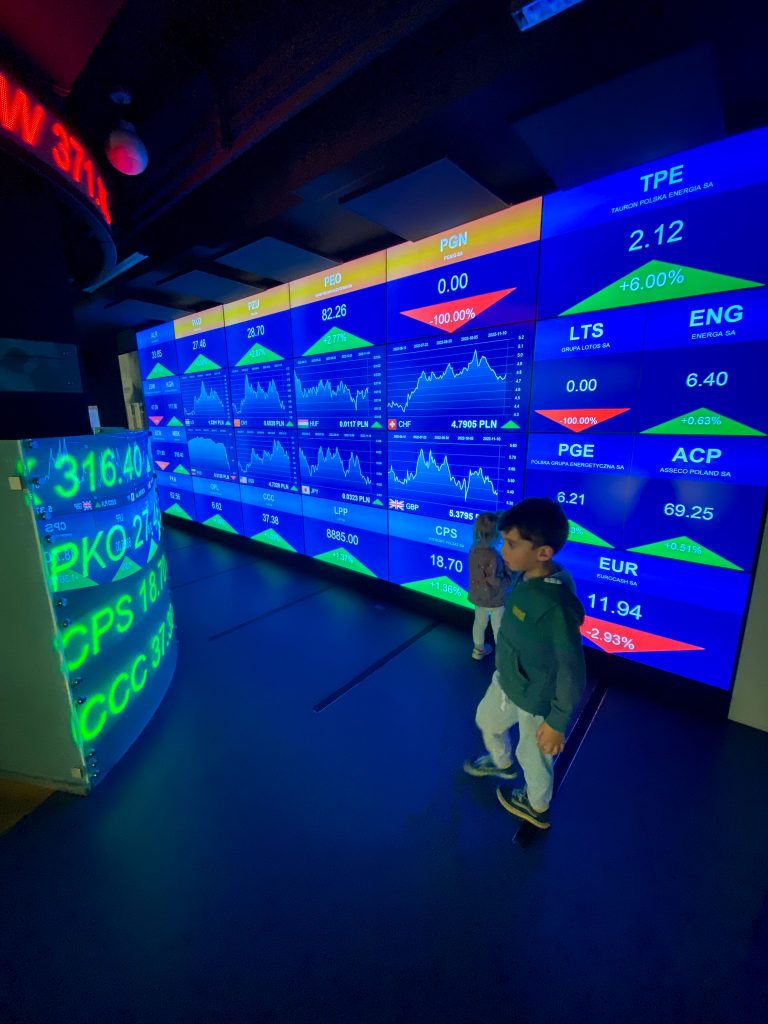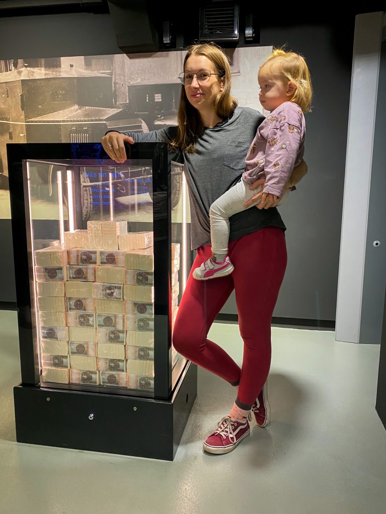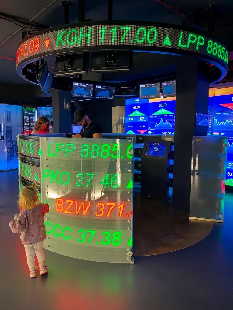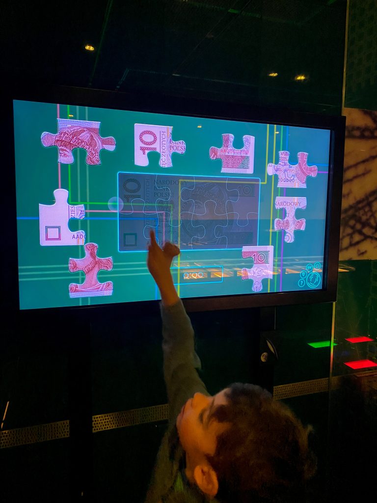Centrum Pieniądza nie jest atrakcją dedykowaną wyłącznie dzieciom. To miejsce dla każdego, dla dorosłych szczególnie. W moim odczuciu im starsze dzieci, tym lepiej – więcej skorzystają. Byłam z sześciolatkiem i dwulatką – osobiście uważam, że to nie miejsce dla dwuletnich maluchów, chociaż dwie godziny dała radę i co mogła to wciskała, albo wciskałam za nią. Jednak chyba nie o takie korzystanie się rozchodzi 😉