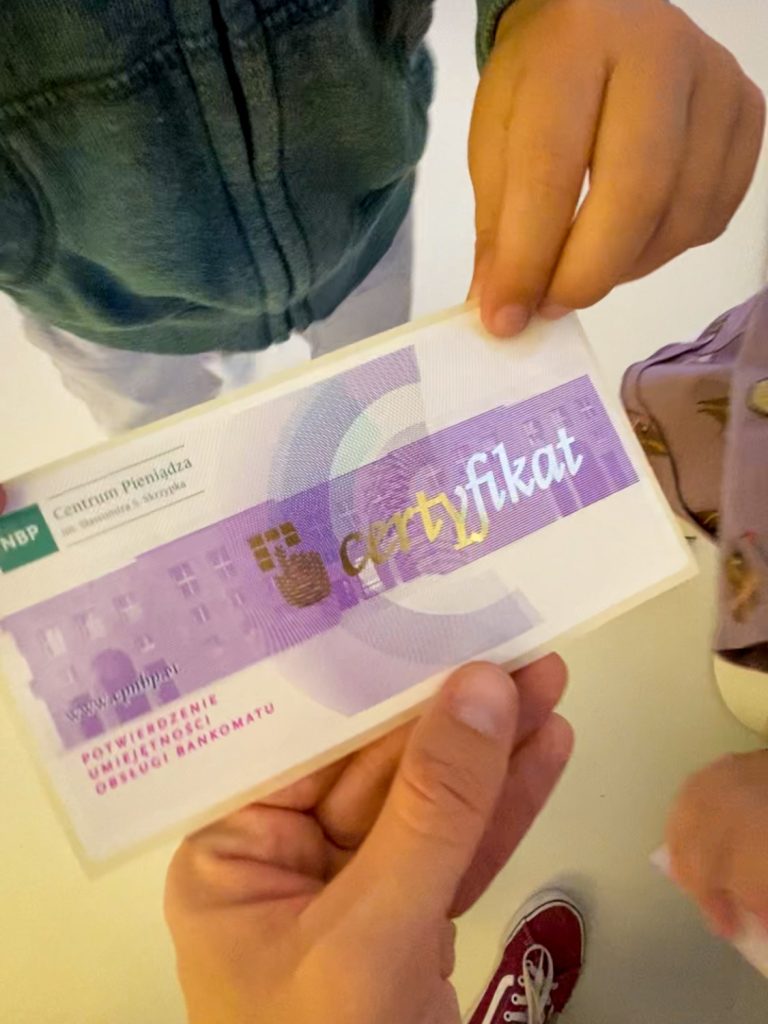 - Imienny certyfikat-naklejka z wizyty w Centrum Pieniądza.