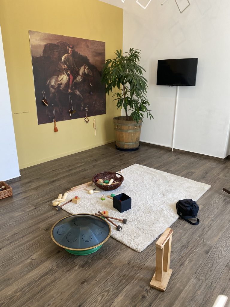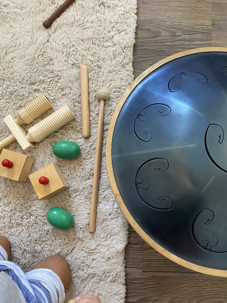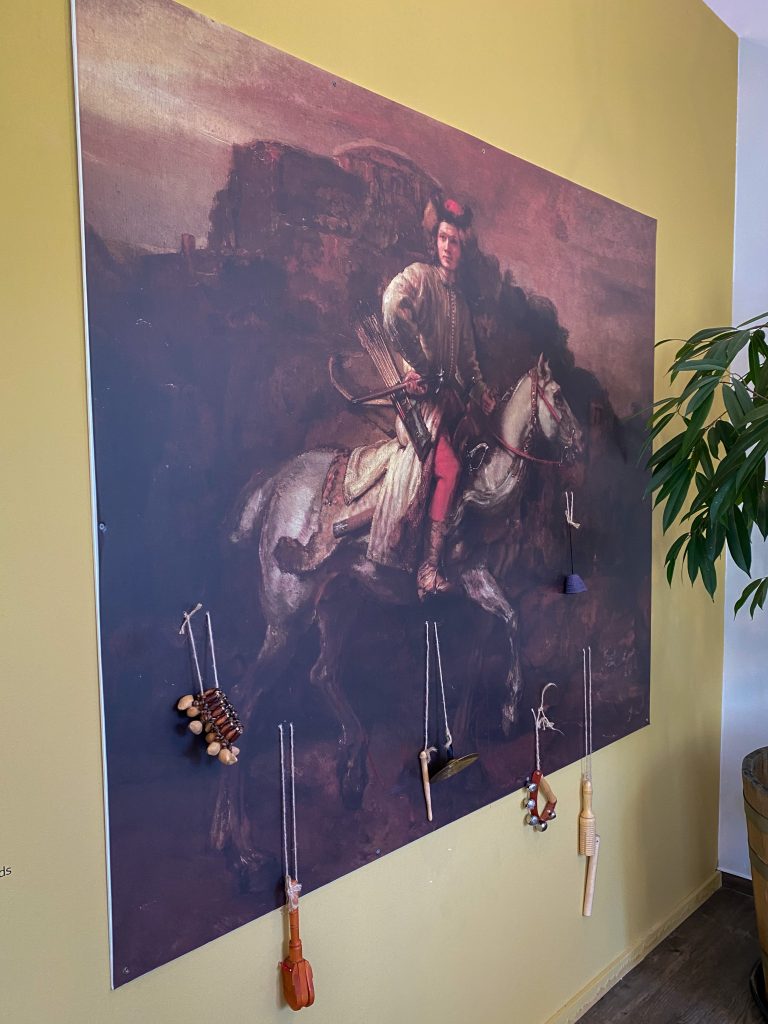 Strefa podzielona jest na kilka sekcji. W pierwszej zapoznajemy się z obrazem Rembrandta, a o nudzie nie ma absolutnie mowy. Do obrazu przyczepione są różne instrumenty, które można dotykać, grać na nich, wyobrażać sobie, że to właśnie ten obraz tak brzmi. Ich wybór nie jest przypadkowy – dzwonki wiszą u szyi konia, przy kopytach znajdziecie instrument dający łudząco podobny dźwięk do ich stukotu. Doświadczycie dźwięków prosto z obrazu:) genialne! A oprócz tego instrument, który mnie pochłonął i zachwycił jak dawno żaden inny: hand drum. Nawet jeśli dzieci nawalają w niego jak dzikie (umówmy się, żadna niespodzianka😬), wciąż brzmi błogo. Są tez grzechotka, przeszkadzajki, kastaniety. Muzykujcie ile wlezie! A kto się obawia hałasu (spokojnie, ilość instrumentów jest rozsądna), ten może skorzystać z ochronnych słuchawek dla dzieci. Dziewczyny ze strefy „Maluję”, rozczuliłyście mnie Waszym wszechstronnym podejściem🫶🏻