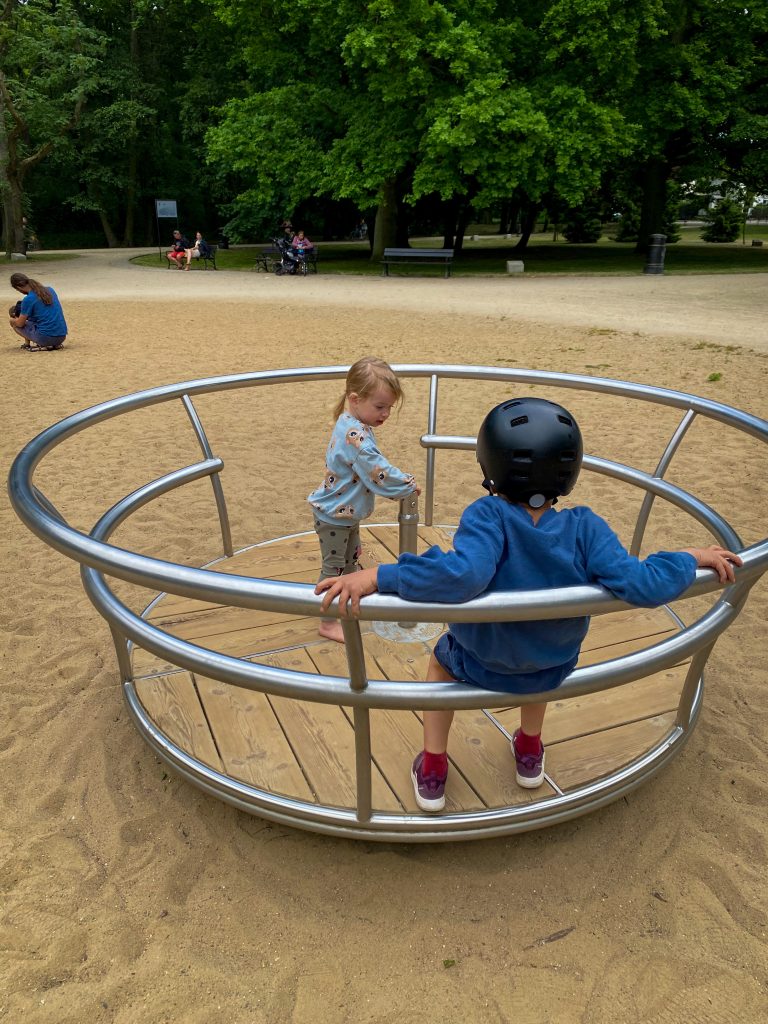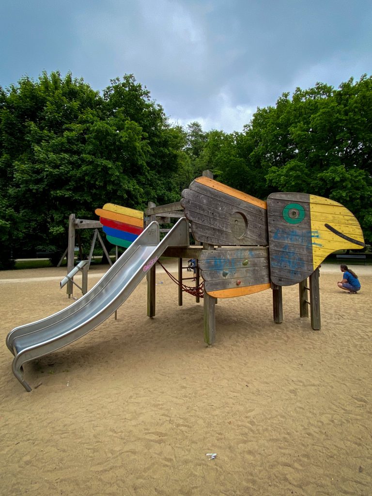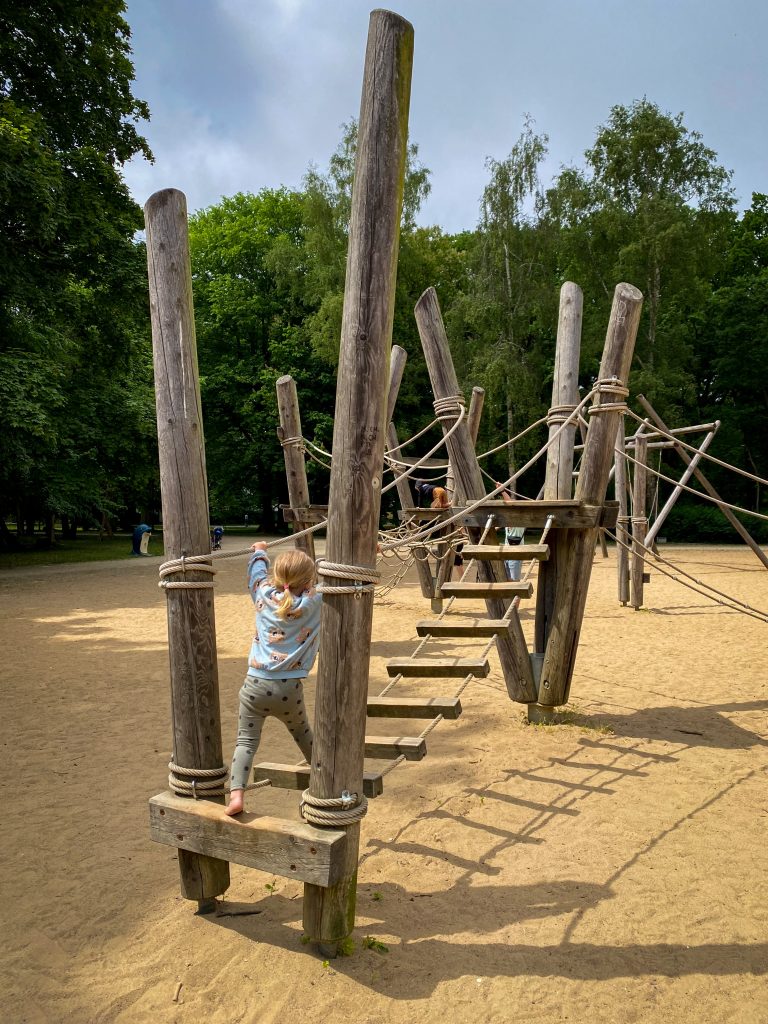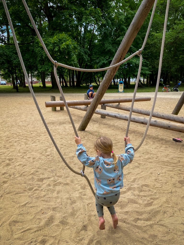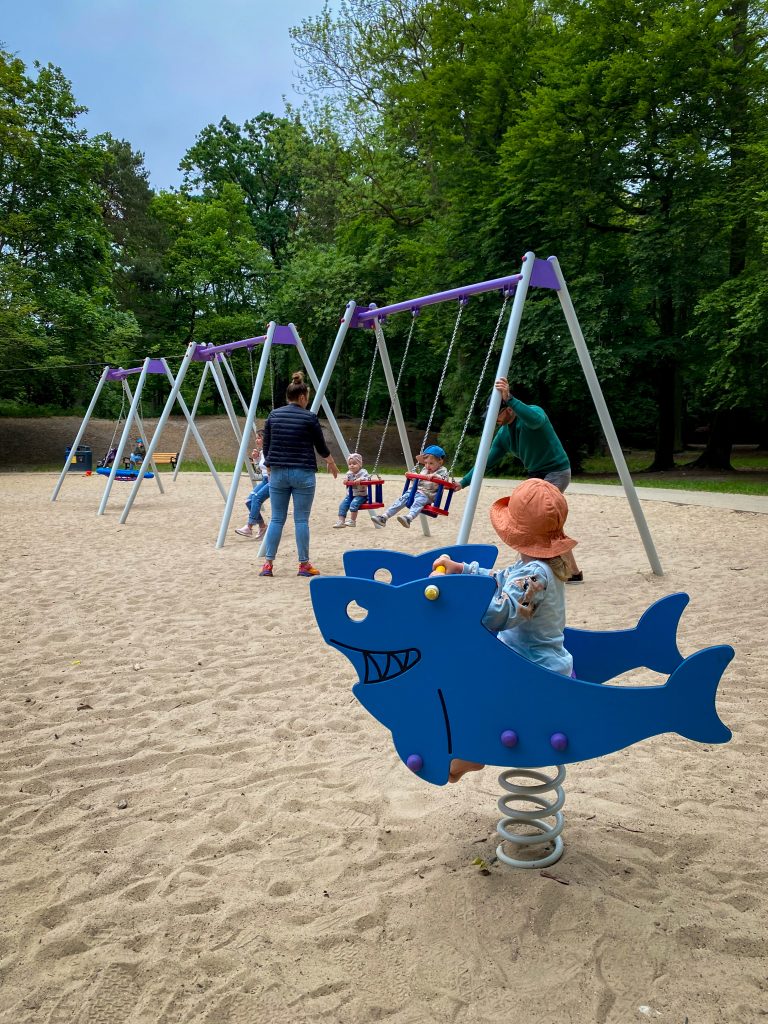 Plac zabaw w drewnie, nieoczywisty. Wymaga pewnej dozy wyobraźni – urządzenia są nietypowe, trzeba wymyślić zastosowanie niektórych z nich. Znajdziecie tam ruchome pochylnie, oryginalne huśtawki, karuzelę i zjeżdżalnię.