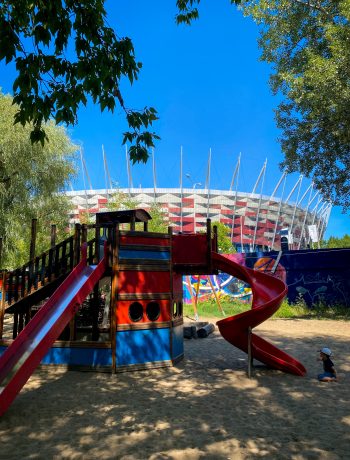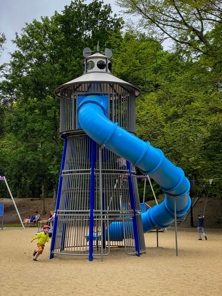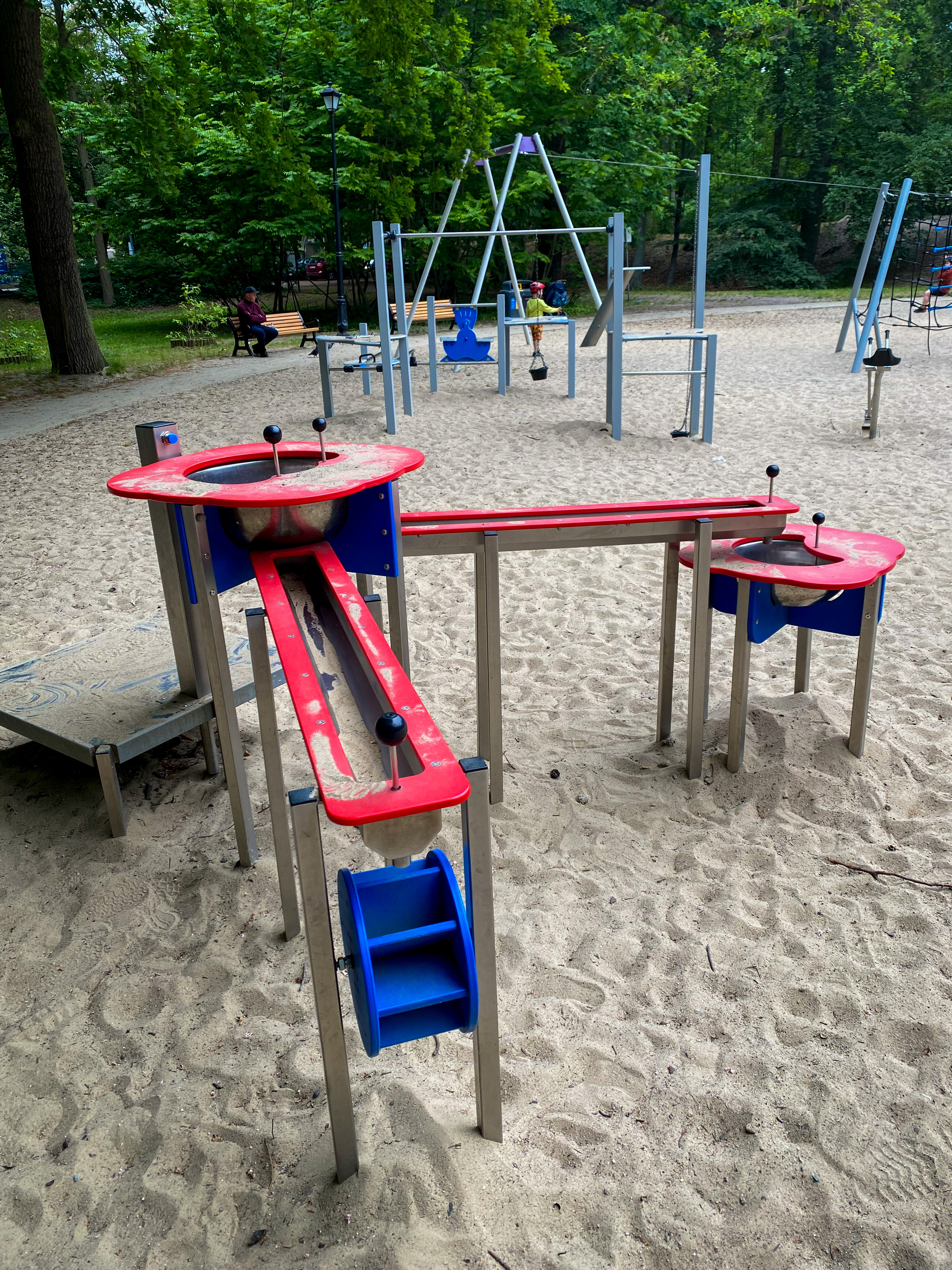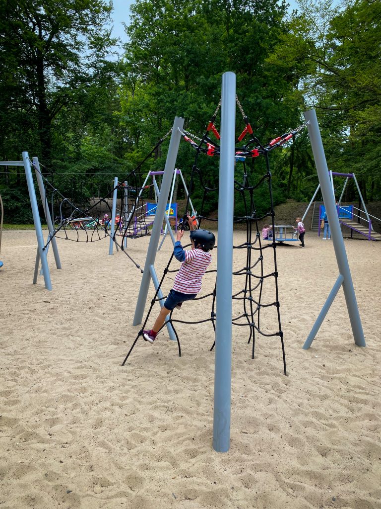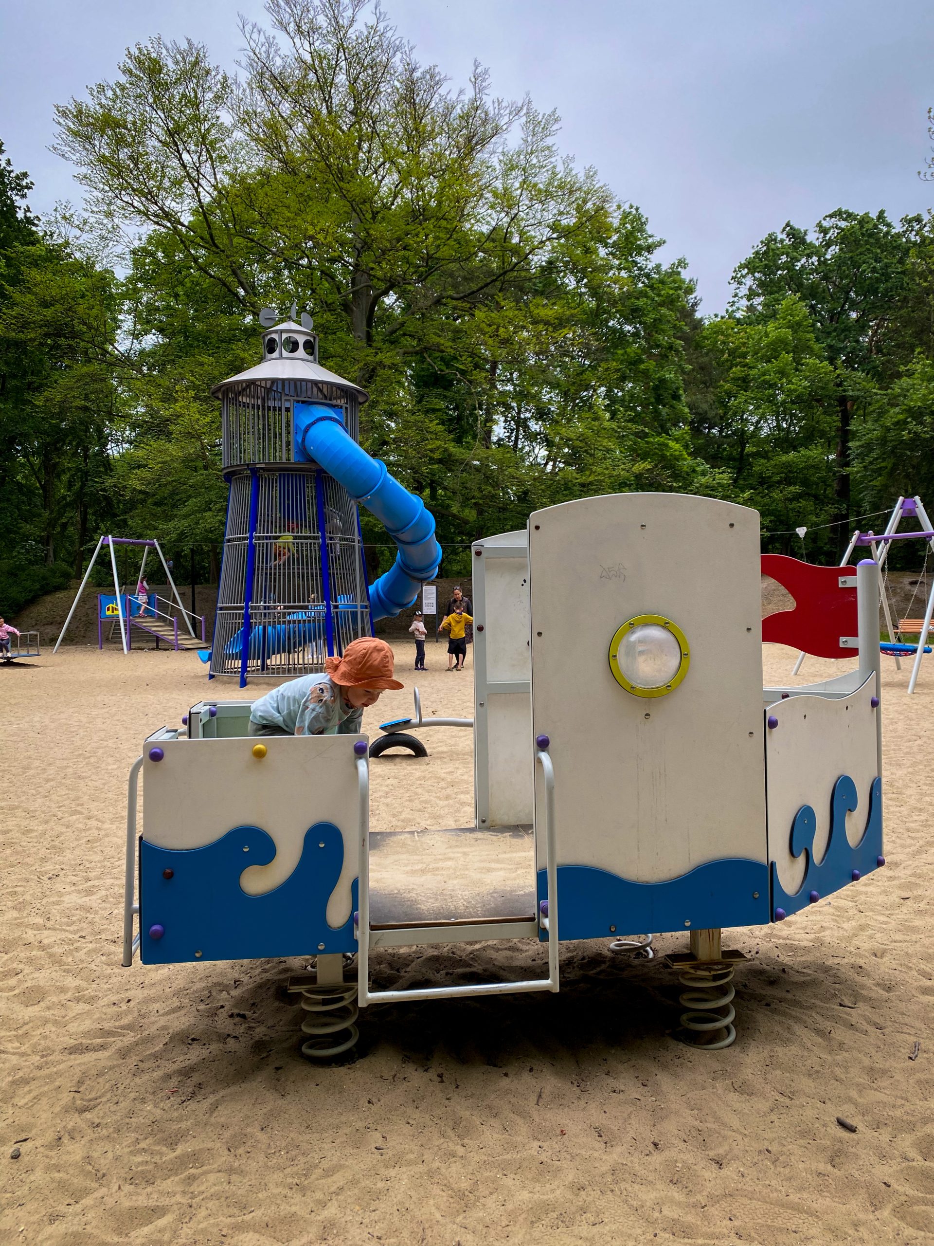 Plac zabaw w drewnie, nieoczywisty. Wymaga pewnej dozy wyobraźni – urządzenia są nietypowe, trzeba wymyślić zastosowanie niektórych z nich. Znajdziecie tam ruchome pochylnie, oryginalne huśtawki, karuzelę i zjeżdżalnię.