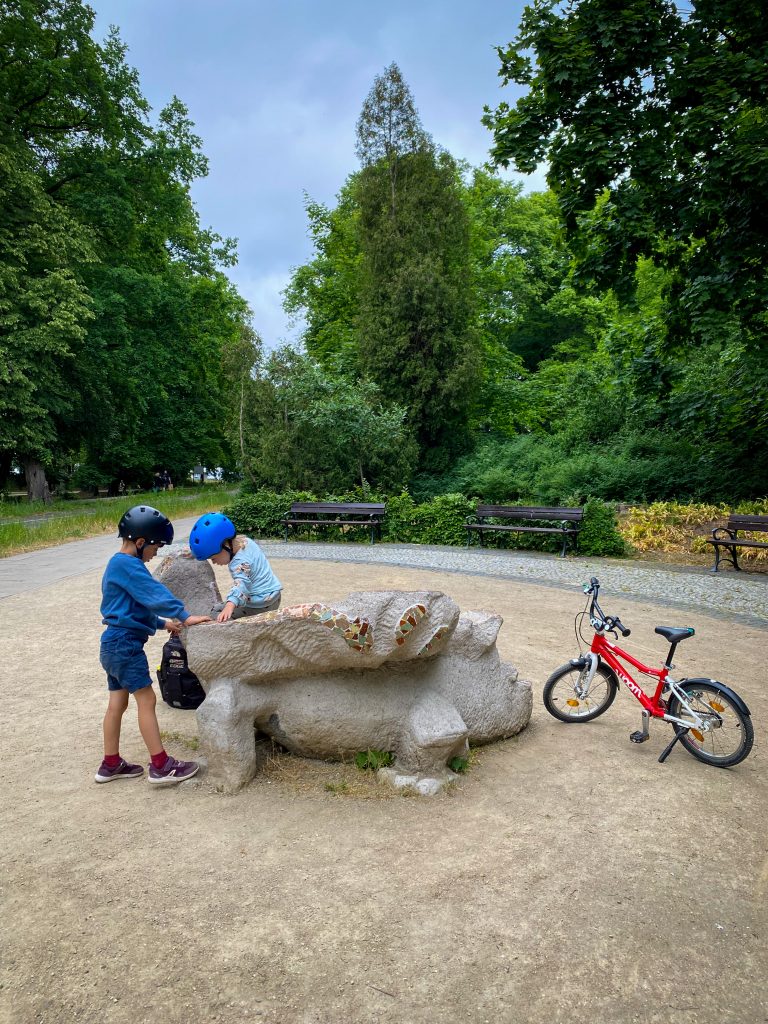 Idąc w kierunku plaży, zahaczycie lokalny przyjemny i rozległy park. Park Zdrojowy, znajdujący się w samym centrum miasta, kryje w sobie dwa naprawdę fajne place zabaw. Nawiasem mówiąc, już samo spacerowanie po parku jest przyjemne, park jest zadbany, ma zwierzęce rzeźby do podziwiania i alejki rowerowo-hulajnogowo przyjazne.