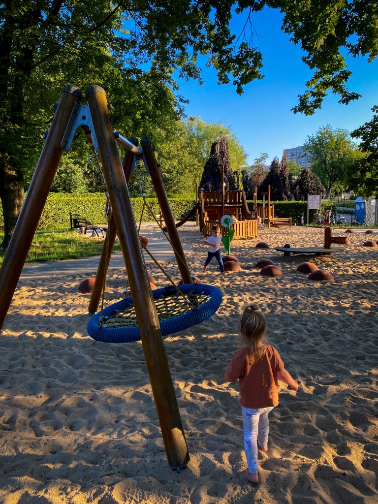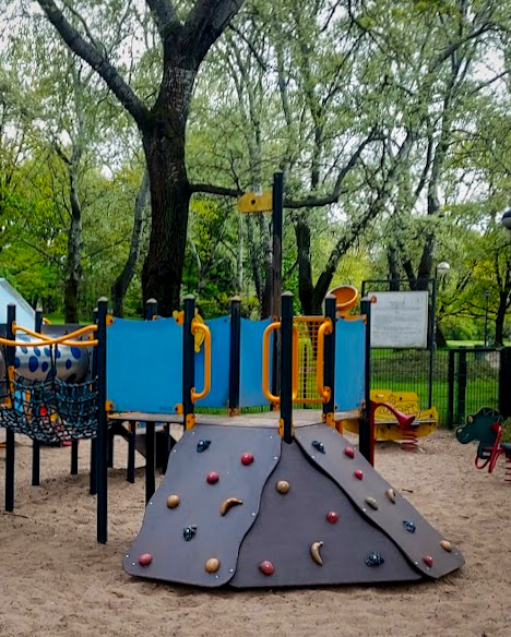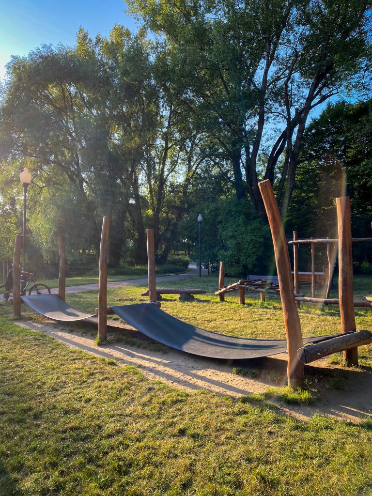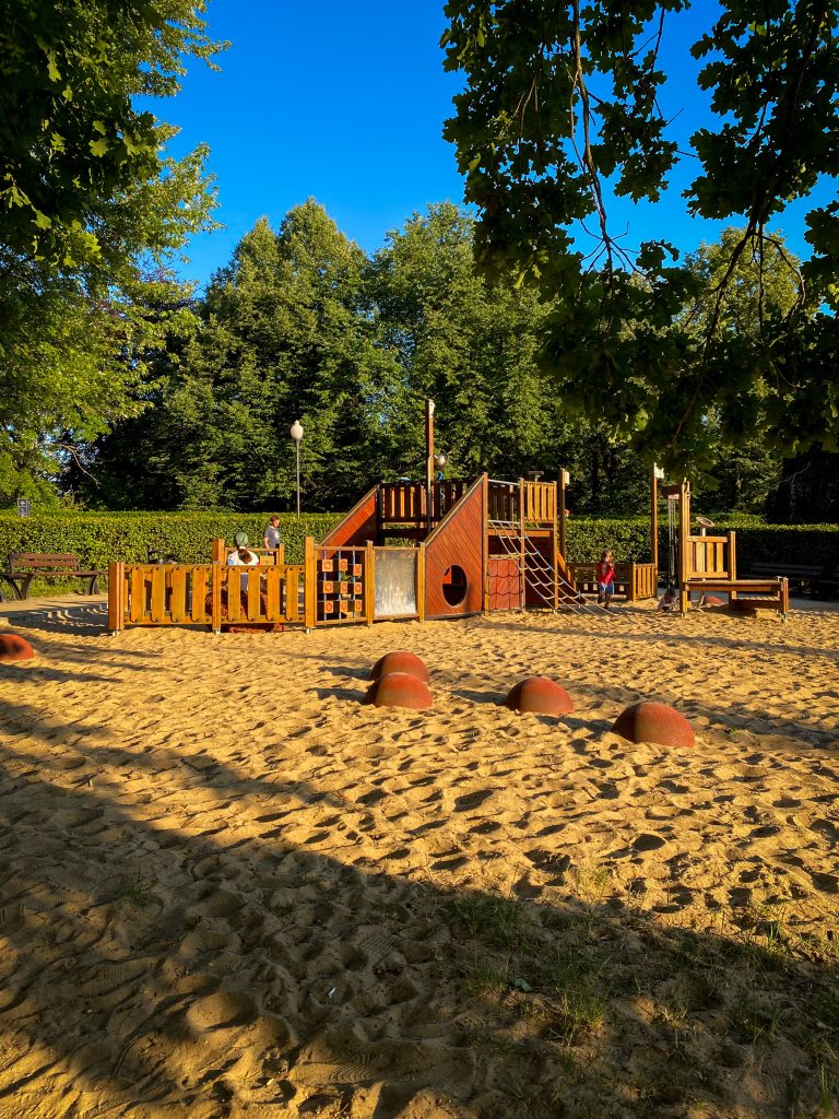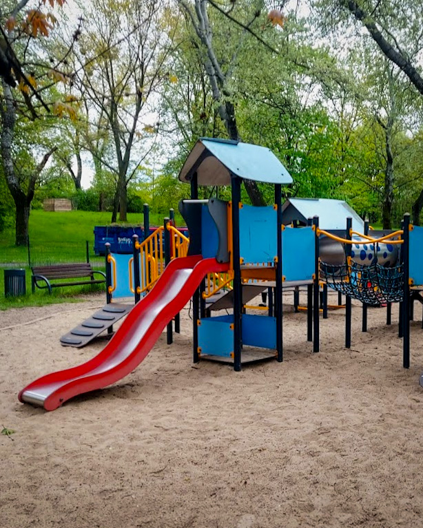 Ogrodzony plac zabaw – (posługuję się nazwami z Google Maps, aby było Wam łatwiej zlokalizować je w aplikacji). Dla mniejszych dzieci. Niskie domki, kładki, zjeżdżalnie. Kilka huśtawek. Mała trampolina.