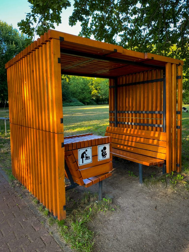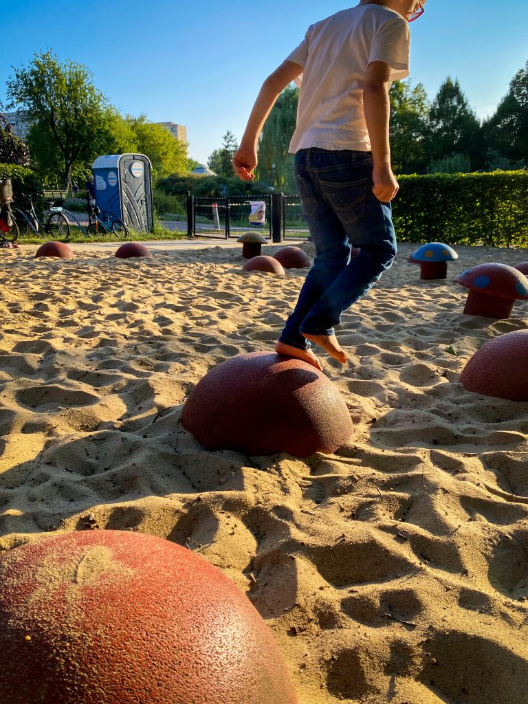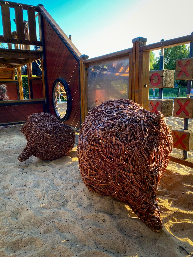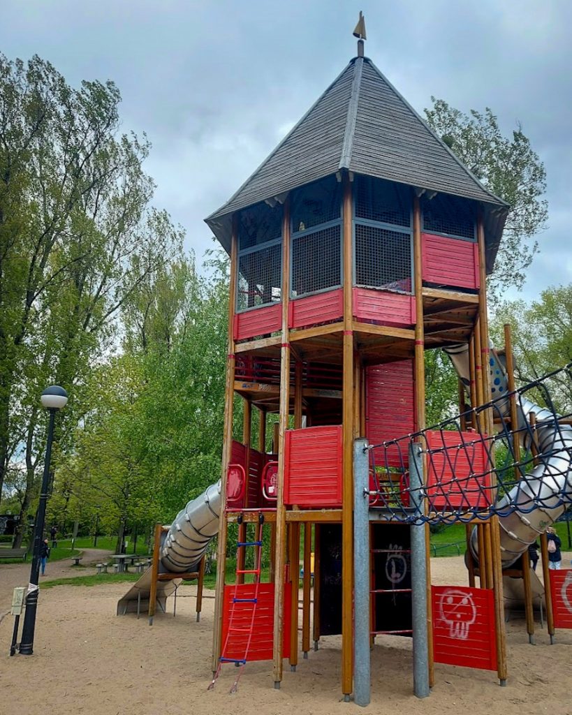 Ogrodzony plac zabaw – (posługuję się nazwami z Google Maps, aby było Wam łatwiej zlokalizować je w aplikacji). Dla mniejszych dzieci. Niskie domki, kładki, zjeżdżalnie. Kilka huśtawek. Mała trampolina.