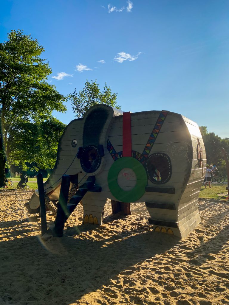 Słoń Bielański – drewniany, piaszczysty, z bujakami, karuzelą, z dużym słoniem do wspinania i zjeżdżania, z gumowymi taśmami do biegania, z równoważniami i torami przeszkód. Są tam naturalne tunele z krzewów i ławki ze stolikami. W sąsiedztwie stół do ping-ponga, kosze do koszykówki, miejsce do karmienia i przewijania dzieci. Miejsce wśród wysokich drzew – szansa na cień w upalne dni.