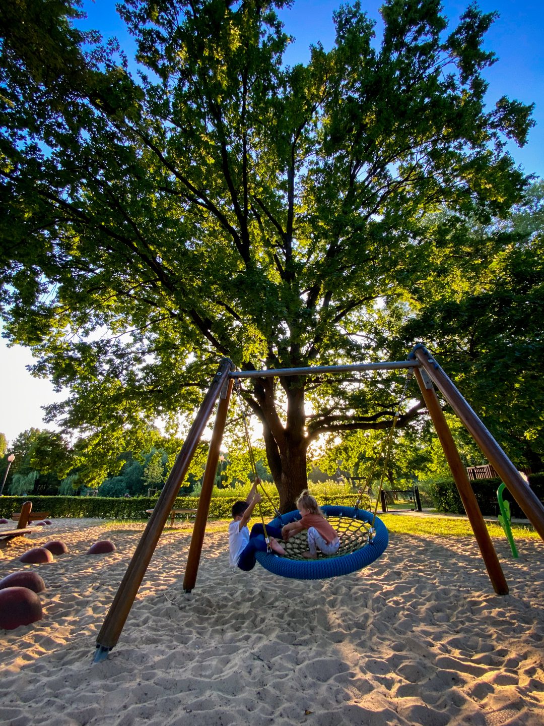 Ogrodzony plac zabaw – (posługuję się nazwami z Google Maps, aby było Wam łatwiej zlokalizować je w aplikacji). Dla mniejszych dzieci. Niskie domki, kładki, zjeżdżalnie. Kilka huśtawek. Mała trampolina.